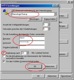 Wählen Sie Ihre DFÜ-Verbindung aus. Geben Sie Ihre Benutzerdaten ein. Selektieren Sie auf Wunsch bitte das Feld